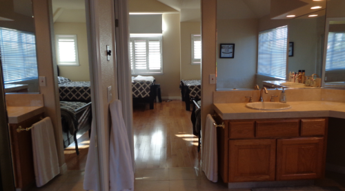 Set near El Camino, this residential sober living facility offers structured housing in a two-story home designed to feel open, calm, and livable. Residents choose between private and shared rooms, all furnished with full-size beds, while the modern layout centers on an open chef’s kitchen with quartz countertops, a large island, hardwood floors, and generous natural light from skylights and sliding doors. Outside, landscaped grounds and flagstone patios create space to unwind, and the master suite adds comfort with a walk-in closet.